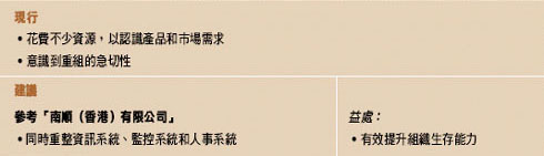 高效的管理信息系統是企業能否做出科學決策和實施有效的內部營運和營銷控制的基礎設施。我們建議,富淵公司應雙管齊下發展一個整合的管理信息系統。一方面,富淵公司應效法「東方紅藥業有限公司」開闢收集各種市場資訊的渠道,包括市場調查、顧客意見反饋、第三方情報等,然後及時對這些市場資訊進行整理、分析,並且在公司內部流通。另一方面,富淵公司可參考「南順(香港)有限公司」的成功經驗,建立一體化的資訊科技系統,使公司管理層和各部門能及時取得銷售、生產的數據;除了提高決策的有效性和科學性,更可加強對買家和應收帳的監控。