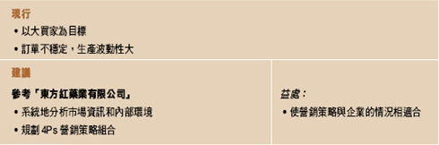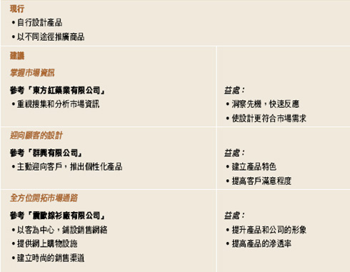 有效的營銷組合必須建基於充分而又準確的市場資訊,更何況珠寶首飾是潮流產品,週期短暫,市場上落變化很快。振業公司經常受到市場季節性變化和行情波動的影響而面臨較高的風險;故此,我們建議振業公司應借鑑「東方紅藥業有限公司」的最佳營商模式,重視搜集和分析市場資訊,投入更多資源去掌握潮流趨勢、市場行情、以及各地市場消費者的喜好,以便能洞察先機,快速反應,更好地設計和推出符合市場需求的產品。振業公司可以聘請顧問進行市場調查、建立靈敏的顧客意見反饋渠道、利用互聯網和其他途徑收取市場最新信息,以及對公司歷年的銷售資料進行統計分析等。