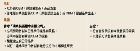 近年,亞洲的生產技術和創意被西方消費者所肯定;加上亞洲產品質素已有一定保證,給予消費者物有所值的印象。由於明譽國際有限公司已具有成熟的歐美市場分銷經驗,我們建議該公司可考慮以歐美地區作為發展品牌的目標市場。為此,公司可投入資源用於歐美市場的調查研究,並派遣研發部及市場部人員到當地瞭解顧客的需求。此外,明譽亦可參考「龍發製藥(香港)有限公司」的最佳營商模式,善用廣告與傳訊,打造「物超所值」的亞洲品牌形象。