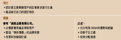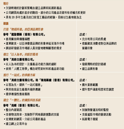 樹立獨特的產品形象和別具一格的設計風格是建立品牌的必備要素。明譽國際的設計部缺乏自己的特色和原創的經驗,是公司品牌發展的主要障礙之一。地毯的外觀花色固然重要,但地毯並非僅僅是一種裝飾品;在本質上,它仍是一種家居用品,實用性和功能性亦是客戶的最主要的考慮。在這一方面,我們建議明譽國際可從「美時文儀有限公司>」的成功經驗中受到啟發;「美時」透過「以人為本」的設計和「以客為本」的服務,在客戶心目中建立了實用、時尚、優質、周到的品牌形象。