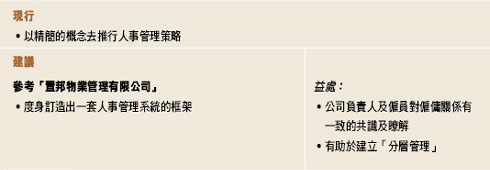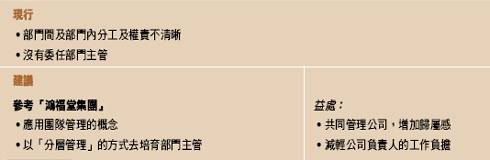 部門內不同員工應有著相輔相成、互補不足的功能,而先達公司的部門現時正欠缺這種「威力」。我們提議該公司參照「置邦物業管理有限公司」透過制定「工作守則」推行優質服務的成功範例,將各部門所有職位的工作範圍、責任及要求詳列出來,並要求各員工以標準的質素和效率去工作及服務顧客,例如標準的送貨時限等,從而建立公司的信譽。另外,公司每年均需對員工作出表現評估;這除了可讓員工瞭解自己工作表現、以及與公司期望的差距之外,更可作為薪酬調整、升職及解僱的指標。