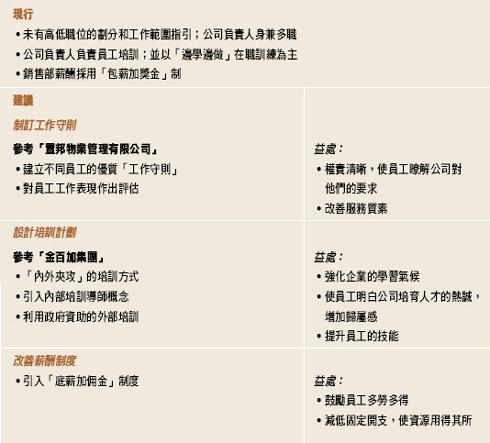 雖然這項建議需要較多資源;但提高員工質素對公司長遠發展有顯著的幫助;而外部培訓的內容和數量亦可根據需要,酌情調整。先達公司還可尋求一些政府的培訓資助及課程,例如「持續發展基金」的認可課程或「中小企培訓基金」支援機構的免費講座等。
