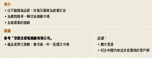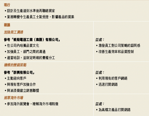 為了提高士氣以及確保生產和品質的有效監控,新興公司可借鑑「蜆殼電器工業(集團)有限公司」推行品質管理文化的最佳營銷模式,重視員工各部門的溝通,亦提供切合需要的培訓;同時清楚界定明確的權責分工,建立一套完善的操作指南和監控系統。我們建議公司的管理層應向各生產工序的員工詳細地解釋公司推行產品檔次和品種多元化的目的及理由,並可透過內部或外部培訓,引進變革管理(Change
