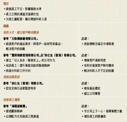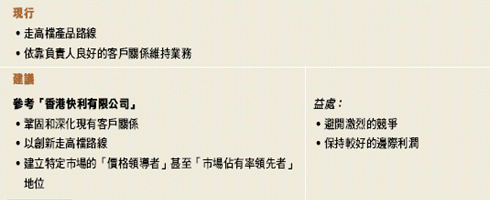 配合「一站式」服務的發展方向,精美印藝公司必須提高自己的生產能力和增加產品線,改變目前祇能應付一小部分工序的情況。現代印刷業的技術一日千里,而精美祇擁有生產部分印刷品的設備;引入新技術和新設備可能費資不菲,會對公司財務構成重大負擔。為此,我們建議精美印藝公司可參考「艾發特有限公司」的成功經驗,與同一供應鏈上的其他企業建立策略聯盟。精美公司可在市場上或者從業務夥伴中尋找一間擁有先進設備、技術水平較高的印刷廠,與其達致合作協議。例如,精美可以用自己的市場聯繫和一定資金,換取對方的股份,或者雙方訂立銷售聯盟。這樣,精美印藝公司便可迅速擴展自己的產品種類,提高生產的實力,改進交貨速度和對客戶的技術支援;從而更有能力在鞏固現有客戶的基礎上,擴展新的客源。