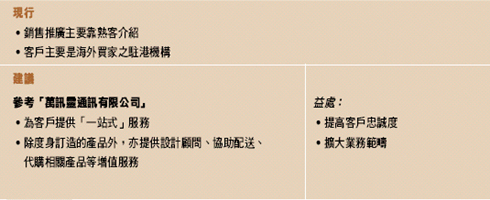 精美印藝公司亦可參考「李錦記有限公司」依托文化網絡進行全球性推廣的策略,利用公司負責人與海外客戶駐港辦事處的良好關係,爭取直接為客戶的海外總部或位於臨近地區的其他分支機構提供產品和服務;或者透過這些人際網絡接觸海外市場的買家。