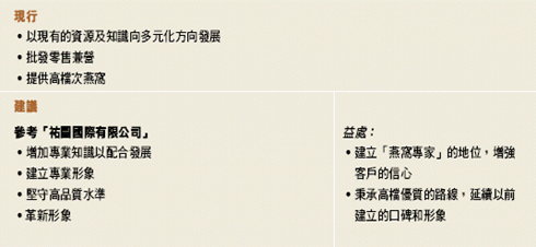 豐裕行已有10多年買賣及出入口燕窩的經驗,並已建立了一定的口碑。豐裕行要從一眾蔘茸海味店中進一步脫穎而出,應借鑑「祐圖國際有限公司」建立專業形象的最佳典範,以一絲不苟的專業精神跟進每個客戶需要,並且提供令顧客放心的品質保證。為了成為名副其實的「燕窩專家」,豐裕行亦需從店面設計和資訊服務等方面下功夫。首先應改善店面貨品擺放位置,突出燕窩銷售專櫃,並爭取獲得代理証書在專櫃上展出;豐裕行亦可搜集不同層面顧客有興趣知道的資訊,例如燕窩的品種、產地、分級標準、療效、烹製方法等,使自己成為燕窩知識專家。鑑於燕窩本屬貴價商品,加上常有假貨或次貨流入市面,顧客都願意光顧信譽可靠而服務良好的專門店;因此,建立專業形象將有助於豐裕行保持優勢和提高定價能力。
