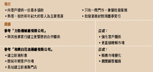 豐裕行的批發客戶以規模較小的商戶居多,這些商戶大多沒有資源作產品推廣。如果豐裕行希望推動市場發展的話,可考慮擔當主導角色,並參照「力勁機械廠有限公司司」以客戶為合作夥伴的經營理念,為客戶提供貼身的售前售後服務及「一條龍」式的產品供應方案。豐裕行更可採用新穎的銷售聯盟方式去推廣產品。例如,豐裕行可以聯同其他蔘茸行劃一採用同一款包裝以及推行統一的會員積分優惠計劃等,藉此以較少量投資為聯盟打造品牌形象,增強宣傳效果。然而,設立聯盟時需留意涉及的溝通程序可能會比較繁複。