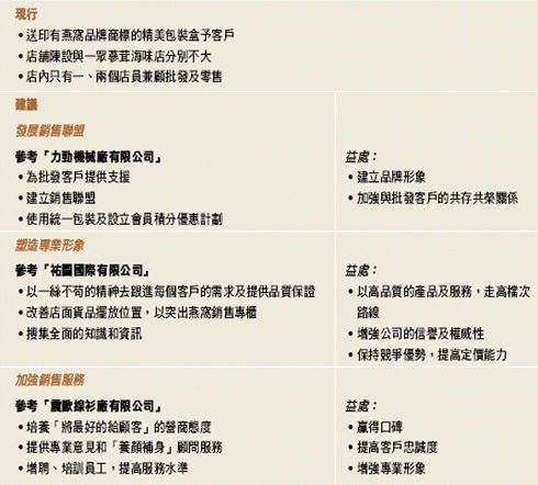現時豐裕行的門市只有兩名員工,遇上繁忙時間,會出現顧此失彼的情況。另外,門市員工的知識多集中於燕窩的買賣,實不足以應付顧客的詢問及服務需求。因此,豐裕行可參考「震歐線衫廠有限公司」奉行「以客為尊」的營商理念,堅持「將最好的給顧客」,熱情為顧客作出最適當選購的建議。豐裕行亦可將自己定位為「養顏補身顧問」,按個別客人的預算及喜好,推薦產品及提供烹調的建議。當然,執行這建議需有額外人力資源相配合,亦需培訓員工專業知識和銷售技巧,以及協調員工的工作分配及範圍。