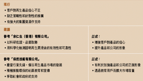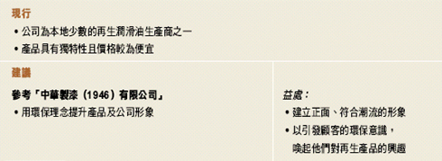 鑑於目前香港政府正大力推動環保工業和環保活動,綠色化工公司主動與政府和一些環保機構聯絡,獲得他們的支持和推薦;並透過政府和環保機構的網絡去接觸一些大量使用潤滑油的商戶,如汽車零售商和汽車維修行等。綠色化工公司可嘗試和這些用家建立多元化的合作關係,例如,在向用家供應再生潤滑油的同時,亦向他們回收廢棄的潤滑油;或者將產品放在汽車零售商處寄售,以增加銷售渠道。