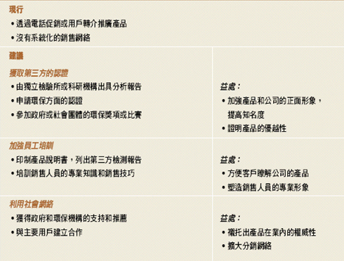 我們亦建議綠色化工公司編制簡單易明的產品介紹,列出獨立第三方的檢測報告,然後向潛在的客戶派發。公司亦應對銷售人員進行培訓,增加他們對產品技術參數和各項性能的認識,並提升銷售技巧;務求銷售人員在接待客戶時能列舉科學數據,並給予客戶專業、嚴謹的印象。